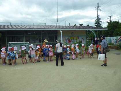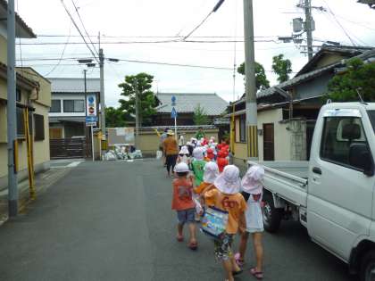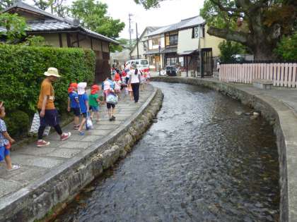 園庭に並んで,人数を確認して,いざ出発。車の横も上手に歩けるようになりました。明神川の横を落ちないように気をつけて通っていきます。