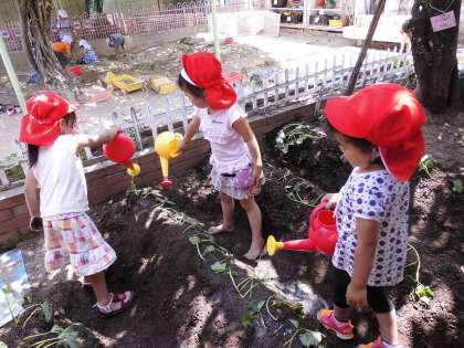 サツマイモの苗を植えました。「すみれ組さんのじゃがいもみたいにいっぱいできたらいいなあ」と,期待を膨らませながら水をいっぱいあげました。