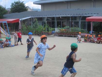 とっても暑いi一日でしたね。プールからあがったすみれ組さん、髪の毛も乾かないうちに「帽子取り、いってきます!」と飛び出していきます。チームに分かれると作戦会議が始まり気持ちをひとつにして「エイエイオー!」と叫びます。自分ひとりで強い気持ちでがんばったり、友達と力を合わせたり、友達を励ましたり、認め合ったり、喜び合ったり…。毎日いろいろな姿が見られ、たくましくなっていっていることを実感しています。みんないい顔をしています。たくさんの感情体験を積み重ねて心身ともに大きくなってほしいですね。がんばれー!
