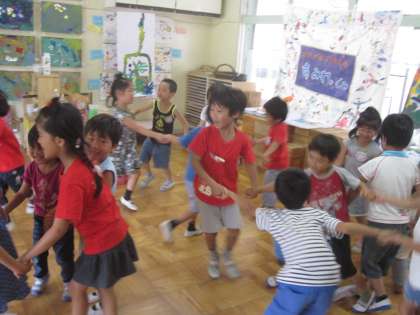 今日で1学期は終わりですが、すみれ組は24,25日の花脊山の家を楽しみにしています。すみれ組の旗も出来上がりました。キャンプファイヤーのときに歌ったり踊ったりする曲で大はしゃぎしています。グループでのお仕事もみんなで確認し合いました。あとは家で準備をおうちの人と一緒にして元気をいっぱいためておいてくださいね。
