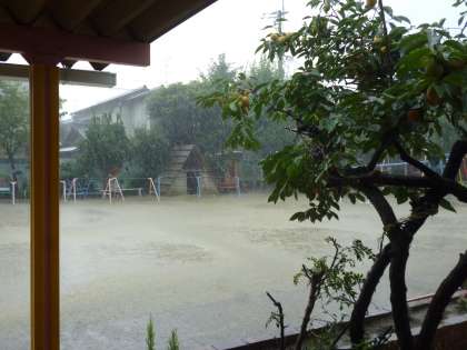 叩きつけるような雨に,道路の表面が霧がかかったように白くなっています。何という雨でしょうか。かと思えば急に空が明るくなって晴れてきました。園庭の雨水も引いてきたなあと思ったとたん,再び強烈な雨。道行く人はみんな,ずぶぬれになっていることでしょう。