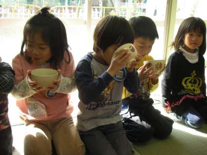 そしたお薄をいただきました。「にがい」「おいしい」と感じたことを友達に話していました。ほとんどの子どもたちは初めてのの体験でした。