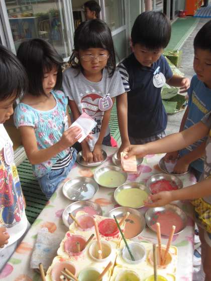 昨日ざくろをかいた絵の具が残っているのを見つけて染紙が始まりました。先日読んだ「ふくろうのそめやさん」のイメージもありテラスでそめやさんごっこを楽しみました。いろいろな折り方を試したり,筆を使って模様をかいたり,思い思いに染めていました。最後に残った絵の具でジュース屋さんごっこへ。いろいろ混ぜるとおいしそうなコーヒーになりましたね。