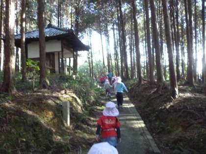 杉林をぬけ,細い道を登ります。「○○ちゃ〜ん,がんばって〜。」やさしい声が飛び交います。