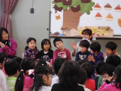 秋風さんに誘われて,はりのおうちから出てきたのは6人のくりのみぼうやと事務職員さん。7人の11月の誕生会をみんなでお祝いしました。