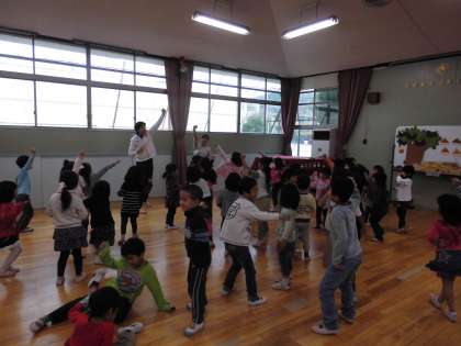 そして,幼稚園大会で先生と子どもたちで楽しんだ「よろしくね」のなかよし遊びをみんなで遊びました。