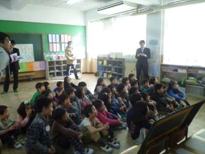 今年度、上賀茂小学校2年生と年長組すみれ組の交流を進めてきましたが、今日は研究発表会の公開授業がありました。2年生はこの日のために幼稚園の子どものことを思いながら、楽しめるようにと準備をしてくれていました。初めは緊張していた子どももいましたが、2年生のペープサートや劇を見たり、絵本を読み聞かせしてもらったりするうちに笑顔がたくさん見られるようになってきました。