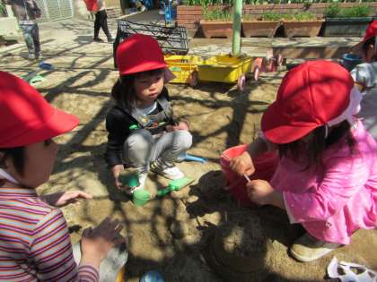 先週つくっていた砂場の同じ場所で今日も、川つくりが始まりました。今日は船や車も川に浮かんでいます。初めは手が汚れることが嫌だった子どもも、友達と一緒だと水や泥で遊ぶ楽しさをtちょっぴり感じている姿が見られるようになってきました。その横ではケーキやプリンをつくってお誕生会が開かれていました。