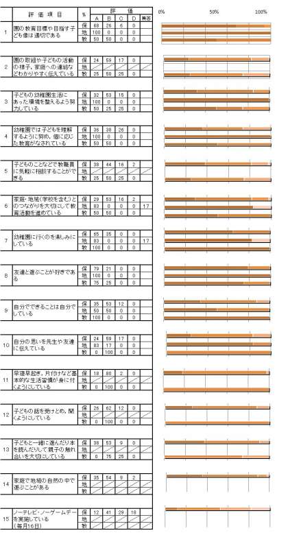 11〜13項目では8割強〜9割の方がABの評価でした。15の項目は月1回のノーテレビ・ノーゲームデーですが16日に限らずご家庭でできる日を意識をもって先月より今月と少しでも前進できるといいですね。何より,親子の触れ合い,かかわりが増えることを願っているのです。そしてエコにもつながるという意図もあります。
