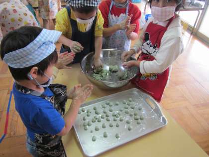 やわらかくなった生地を丸めていきます。「ばら組さんが食べやすい大きさにしてあげよう」「このくらいかなあ」「こっちのは大きすぎるわ」とていねいにていねいに丸めていきます。