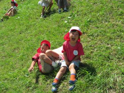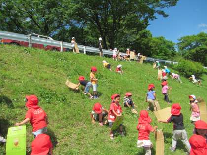 今日はゆり組さんとばら組さんと一緒に,近くの賀茂川へ土手すべりに行きました。お尻にダンボールを敷いて,土手の上から下まで滑り降ります。最初はなかなかスピードが出ませんが、体の傾きを変えてみたり,友達の姿を真似したりして,コツをつかんでくると、すごい勢いで滑り下りるようになりました。