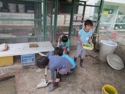 ゆり組はグループで動物当番をしています。野菜を包丁で刻んでうさぎ小屋の掃除をします。今日はとらグループさん。見えないところまでお掃除をしてくれていました。きっと、うさぎさんやうこっけいさん、喜んでいるよ。ありがとう。