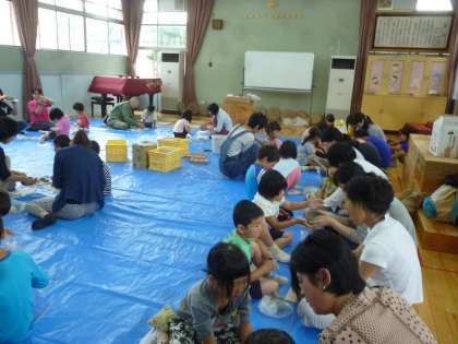 まずは「ゆり組」さんから。お茶碗を造りました。このお茶碗は,お茶会の時に使います。親と子で協力して造りました。