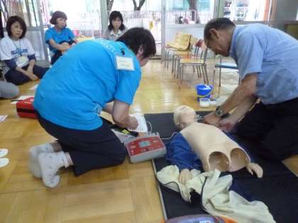 意識の確認→人を呼ぶ→「あなた(指さして)救急車を呼んでください。」「あなたは(指さして)AEDを持ってきて下さい。」と指示を出す→呼吸の確認→(呼吸をしない場合)胸骨圧迫→気道確保→人工呼吸。などの手順を実際に行いました。