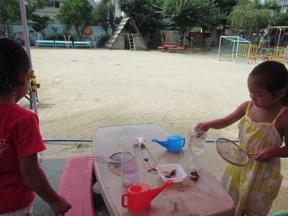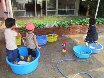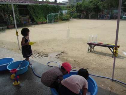 わくわく広場の子どもたちと水遊びをしました。水鉄砲でペットボトルを倒したり、花の色水をつくったりと、まだ涼しいうちに木陰で外遊びを楽しみました。お外カフェでティータイムをとってみんなでお茶も飲みました。暑いときだからこその遊びをしながらも、熱中症の予防に十分配慮していきたいと思います。おでかけをしているお友達も暑さ対策を忘れずに過ごしてくださいね。
