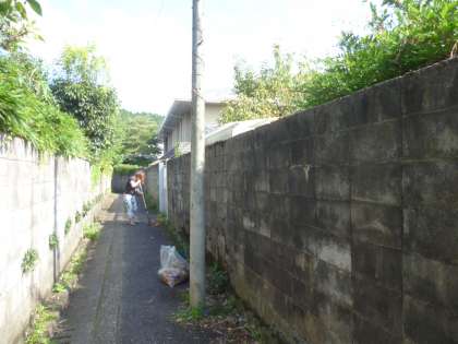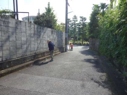 PTAでは,月に1回,園周辺(南・西側)の清掃を行っています。細い道の清掃です。時々,人や自転車が通ります。気をつけながら落ち葉やゴミを集めています。