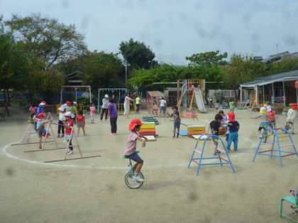 竹馬・なわとび・跳び箱・一輪車・鉄棒…いろいろな遊びをしています。自分がしたい遊びをとことんしています。