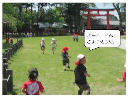 今日はばら組さん(年少組)とゆり組さん(年長組)と一緒に上賀茂神社へお散歩に出かけました。上賀茂神社は自然がいっぱい。たくさん体を動かして遊びました。