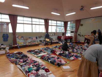明日 9時〜12時。バザーです。準備が進んでいます。