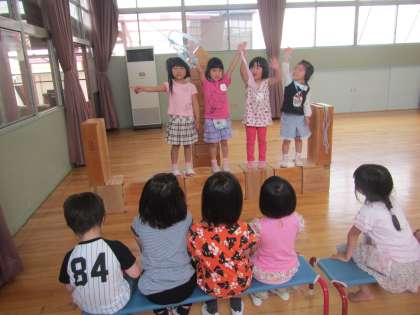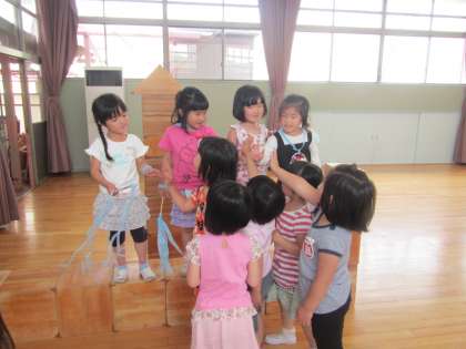 ダンスショーの最後は,「またきてね〜」の呼掛けに応じるように,年少組の友達が,タッチをしに来てくれました。お互いがとてもいい表情をしていました。