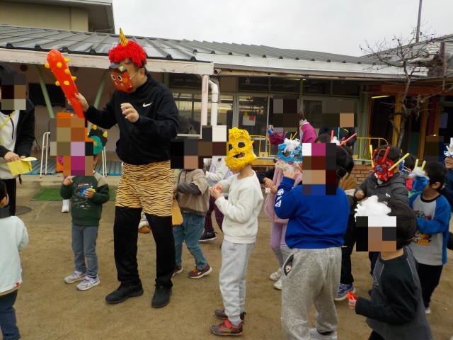 園庭に出ると、園長先生にそっくりの鬼の姿が!「鬼は外!福は内〜!」と元気いっぱいの小さな鬼さんたちでした♪