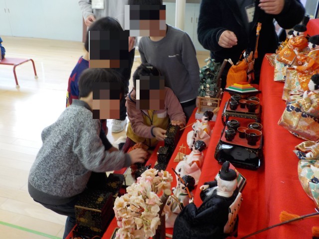 みんなで雛人形を飾りましたよ。写真や絵を見ながら、「どこに飾ったらよいかなぁ」「これはどんな意味があるのかなぁ」とみんなで相談していました。