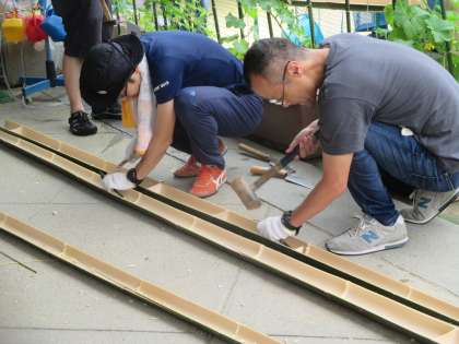 暑い中,有志のお父さん方が汗をかいて,竹を割ったり切ったりする様子を,子どもたちは見ていました。