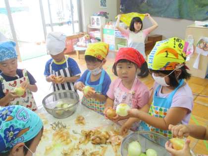 4歳児は野菜の皮をむき係です。