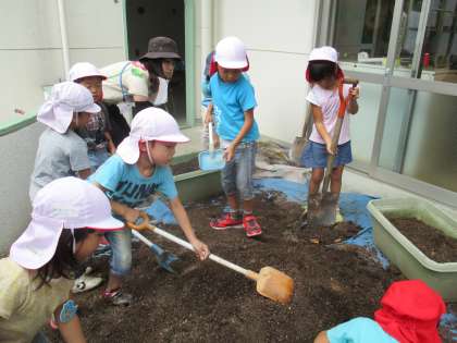 プランターの土をひっくり返して山にして,それに肥料を入れて,大きなスコップでよく混ぜました。