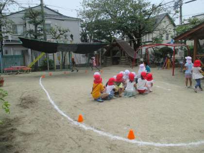 小さな園庭でカーブが多いのですが,次の友達にバトンを渡すのに,一生懸命走っています。