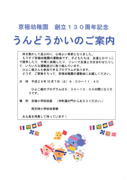 京極幼稚園の運動会が10月7日(土)京極小学校にて行われます。