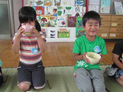 今日は地域の,京極更生保護女性会の皆様にお世話になり年長ことり組がお茶体験をしました。