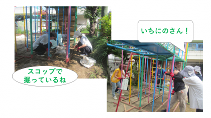 数日前から、総合遊具の下で、先生たちがスコップで土を掘っていました。