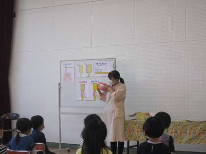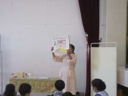幼稚園歯科医の先生と歯科衛生士の先生に来ていただき、歯みがき指導を行いました。紙芝居の読み聞かせや歯ブラシの選び方、模型を使って歯のみがき方などを教えてもらいました。