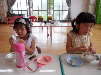 朝から鶴山公園まで神輿を担いで、おうちの方や鶴山保育所の友達に見てもらいました。幼稚園に戻ってプールに入った後は、はな組をお祭りごっこに招待しました。ことり組の子どもたちは、「お客さん一杯で忙しかったけど、楽しかった〜」との感想でした。その後、好きな具を選んでのおにぎりパーティーです。「どれをいれよう〜」と迷いながらも、「梅と昆布と鮭にした」「ごましおとお塩にした」と、それぞれの好みのおにぎりができて、嬉しそうでした。