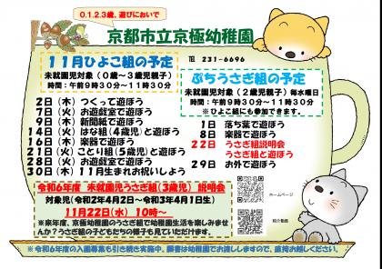 11月は、幼稚園のお兄さんお姉さん(5歳児ことり組・4歳児はな組)と一緒に遊んだり、3歳児うさぎ組のお友達と遊んだりする機会があります。ぜひ遊びに来て、幼稚園の様子を見たり体験したりしてくださいね。