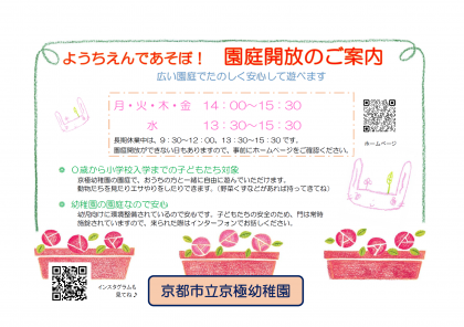 京極幼稚園では、未就園児クラス(うさぎ組・ぷちうさぎ組・ひよこ組)で、保育時間中に遊ぶ以外にも、幼稚園のお庭で遊べる園庭開放もしています。どうぞ遊びに来てください。(画像が見えにくい場合は、こちらからご確認ください)園庭開放