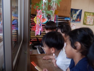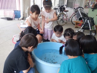 先週の金曜と土曜は,近所の桝形商店街の七夕夜市。夜市を楽しんできた子どもたちが金魚すくいを楽しみ,幼稚園に連れてきてくれました。新しい仲間が増えて子どもたちは興味津々で,エサを食べる様子を見て楽しみました。無事に成長してくれたらうれしいですね。