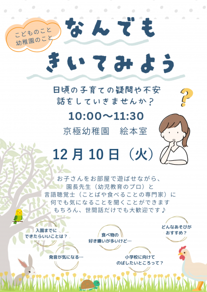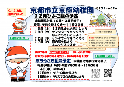 12月のひよこ組ぷちうさぎ組の予定です。12月も11月に引き続き、「なんでもきいてみよう」の日を企画していますので、気軽にお話しに来てください。