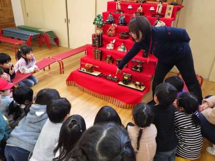 ことり組、はな組の子どもたちでひな人形を飾りました。お人形や小さな道具などを気を付けて持ち運び「これはどこ?」「こっちちゃう?」と置き場所を尋ねたり、写真を見て確認したりする子どもたち…。飾り終ったひな壇をじっくり眺めながら先生の話を聞いたり、「うれしいひなまつり」を歌ったりして楽しみました♪ひな祭りの集いでも、きっと色々なお話が聞けるよ!楽しみにしていてね。