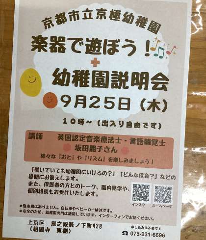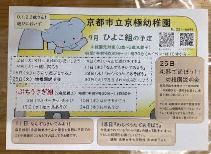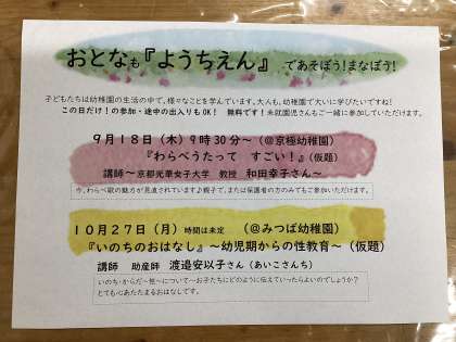 大人向けのお話や、楽器で遊ぼう、幼稚園説明会なども予定しています。まだまだ暑い日が続きます。皆様お気を付けてお越しください。