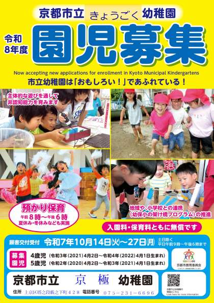 入園願書のお渡しは10月14日9時からです。京極幼稚園の見学希望や保育についてのお問合せなどは、いつも受け付けています。気軽にお電話やメールでお問い合わせください。