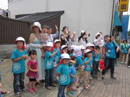 花背山の家を後にして,バスに向かう子どもたちの後ろ姿は大きな荷物を背負って逞しく輝いていました。お母さんの温かいお迎えの表情と,生活を共にしてきた待賢幼稚園の子どもたちに手を振る姿に,充実した花背山の家の宿泊保育だったなと思いました。