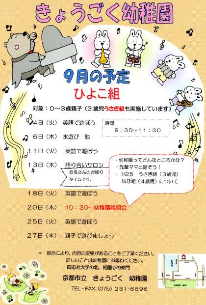 暑い日が続きますが,幼稚園の子どもたちはプール遊びを楽しんでいます。9月のひよこ組のご案内です。京極幼稚園に遊びに来てください。