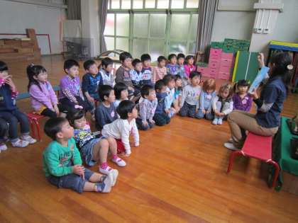 こどもの日についての話やこいのぼりの話を先生に聞いてから、「こいのぼり」の歌を歌ったり、絵本を見たりしました。