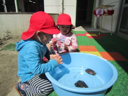 年長のことり組から引き継いだ亀の”おかめちゃん”と”こかめちゃん”。