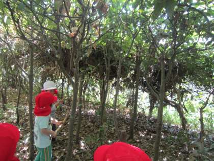 ジャングルで「はっぱお化け」を見つけたり、葉っぱをいっぱい集めてひよこの卵を温めたり、大きな木に座って魚釣りをしたりして遊びました。