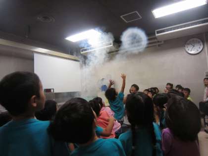 空気砲の実験を見たり,プラネタリウムで星を眺めたり,子どもたちはどのコーナーも興味津々で夢中になって見ていました。