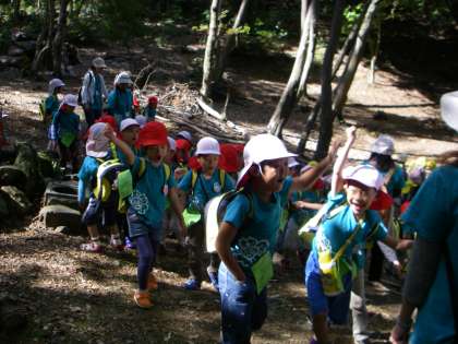 石ころや木の根っこがごつごつ張り出している土の道を歩くのは、アスファルトの道を歩き慣れた子どもたちには難しいのですが、足を踏ん張って一生懸命登りました。