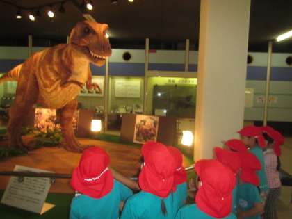 入口の大きな恐竜を見て「これは○○ザウルス」「肉食や」と自分が知っていることを口々に話しながら、長い間見ていました。